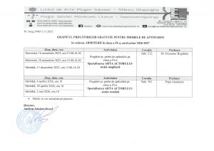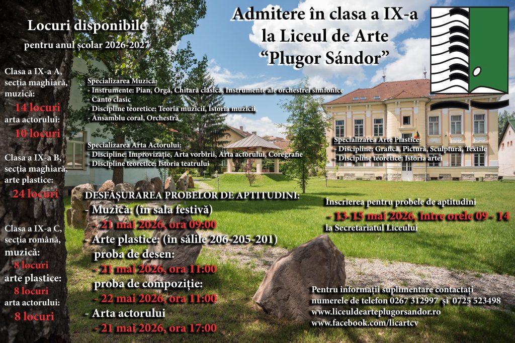 Informații suplimentare privind actele necesare pentru înscriere și bibliografia concursului se pot obține de la avizierul școlii, la numerele de telefon 0731 367 344, 0267 312 997 sau prin email la edu@liceuldearteplugorsandor.ro\
