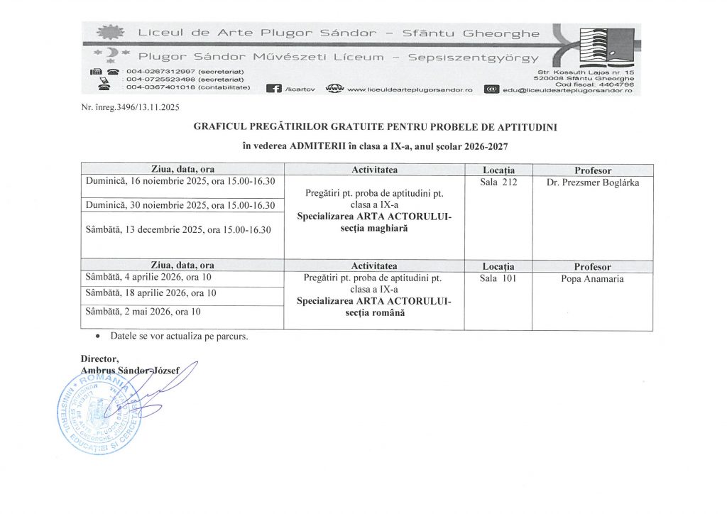 A jelentkezéshez szükséges iratokról és a versenyvizsgára vonatkozó könyvészetről bővebb tájékoztatás az iskola hirdetőjén, illetve a 0731367344, 0267312997 telefonszámon valamint az edu@liceuldearteplugorsandor.ro email címen lehet.