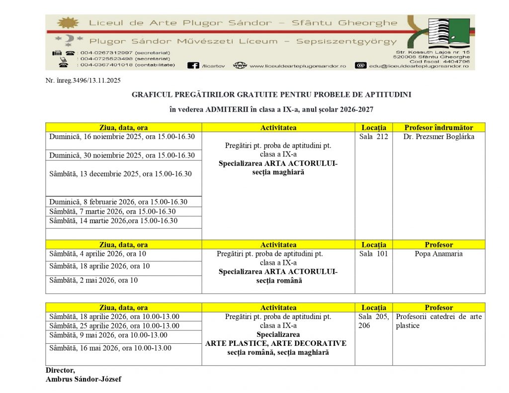Informații suplimentare privind actele necesare pentru înscriere și bibliografia concursului se pot obține de la avizierul școlii, la numerele de telefon 0731 367 344, 0267 312 997 sau prin email la edu@liceuldearteplugorsandor.ro